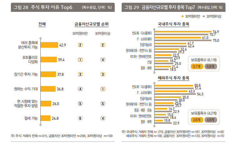 금융자산 30억원 이상 : 국내주식 평균 6.8개 / 해외주식 4.8개 보유