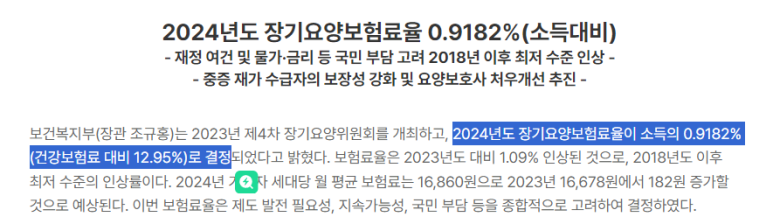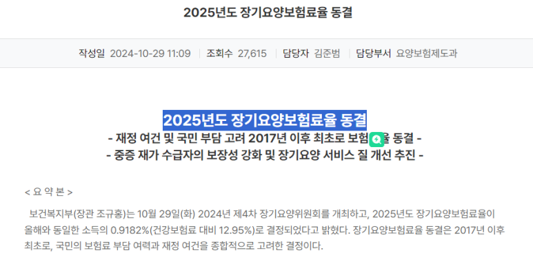 보건복지부 보도자료(장기요양보험료율 : 0.9182%)