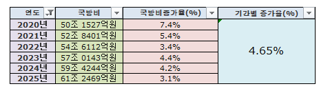 2020년대 국방비 예산 증가율은 4.65%입니다.