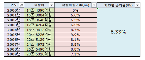 2000년대 대한민국 국방비 증가율은 평균 6.33%입니다.