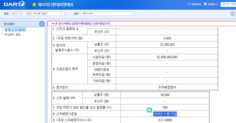 자료 : 2024년 10월 31일 에이치디현대이앤에프 유상증자 결정 공시