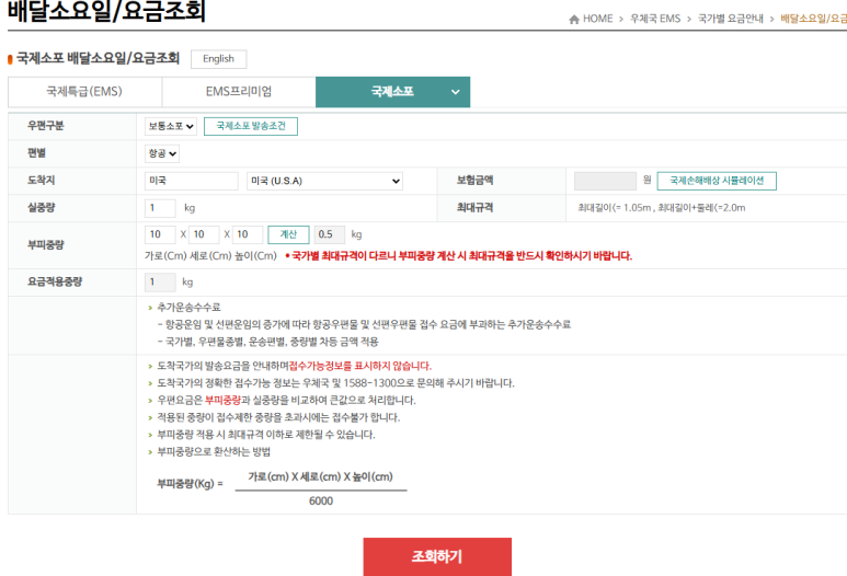 국제소포 배달소요일 및 요금 조회 시뮬레이션 예시
