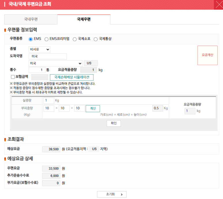 아래 내용은 참고용으로 실제 우편 접수 시 정확한 요금이 계산됩니다.