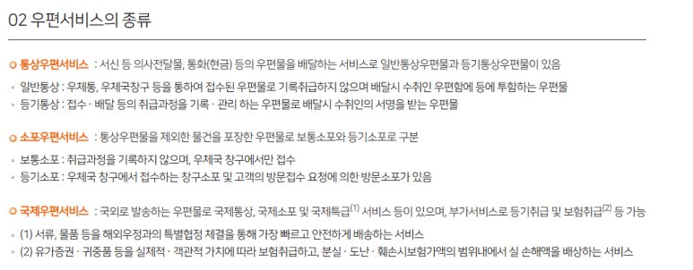 -등기소포 : 우체국 창구에서 접수하는 창구소포 및 고객의 방문접수 요청에 의한 방문소포가 있음