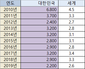 2019년 대한민국 경제성장률 : 2.2%