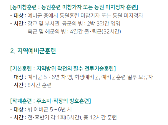 -지역예비군훈련 : 지역방위 목적의 훈련으로 기본훈련, 작계훈련이 있음
