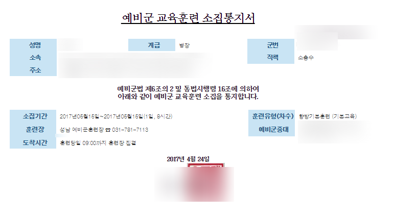 자료 :네이버 메일(예비군 교육훈련 소집통지서)