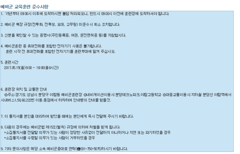 자료 :예비군 교육훈련 소집통지서 준수사항)