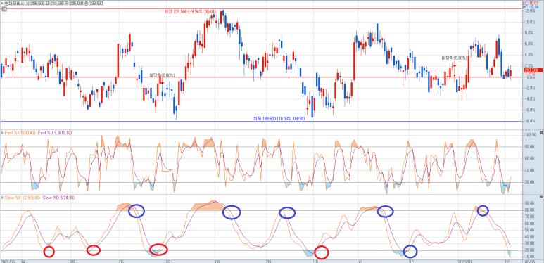 아까 스토캐스틱 패스트로 했던 현대모비스 박스권 차트에서