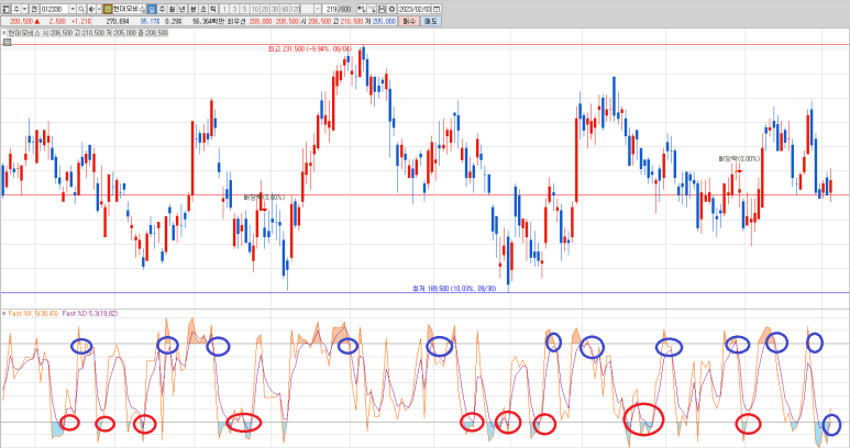 스토캐스틱은 이론적으로 주가가 박스권일 때 효과가 좋습니다.
