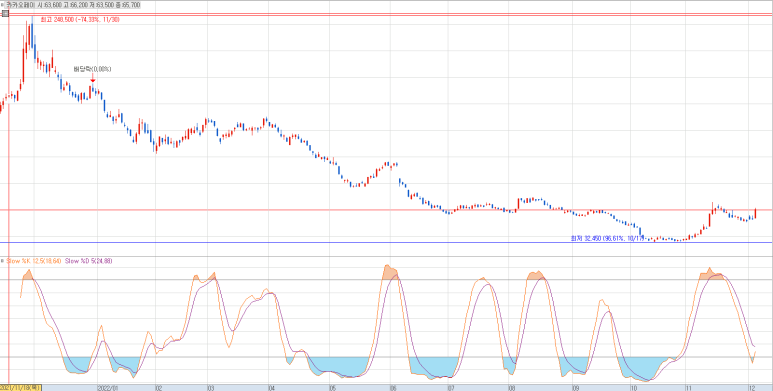 카카오페이처럼 하락 추세일 때 과매도 구간에서 매수신호가 포착되지만,