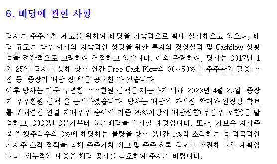 연간 Free Cash Flow의 30~50%를 주주환원 추진을 목표로 한다고 했습니다.