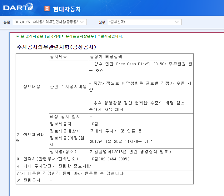 현대자동차의 배당정책은 2017년 1월 공시를 통해