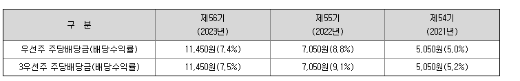 2023년 12월 말(배당기준일 : 24년 2월 29일) : 8,450원(시가배당율 7.7%)