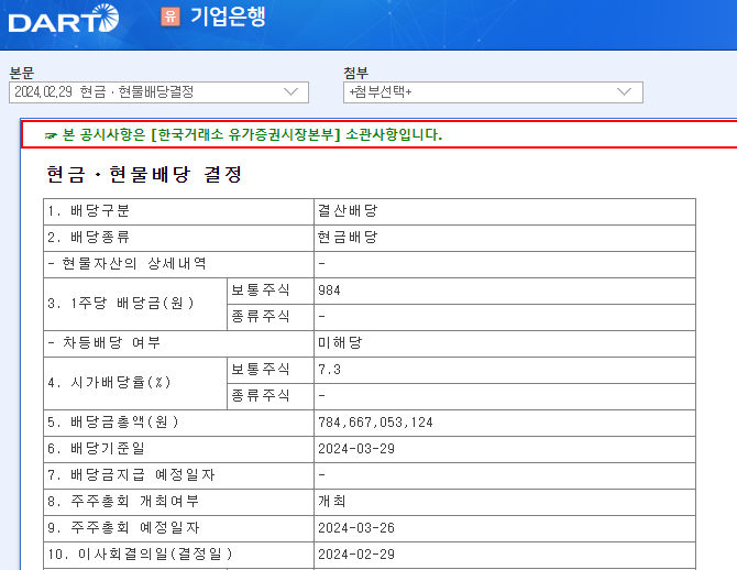 24년 4월 30일 사업보고서 IBK 기업은행 배당정책