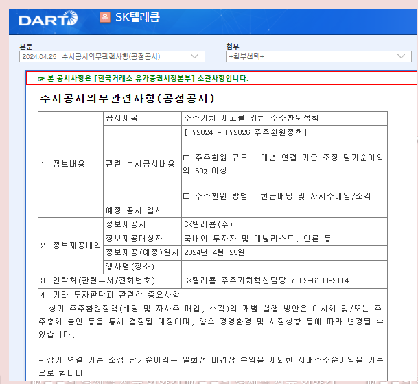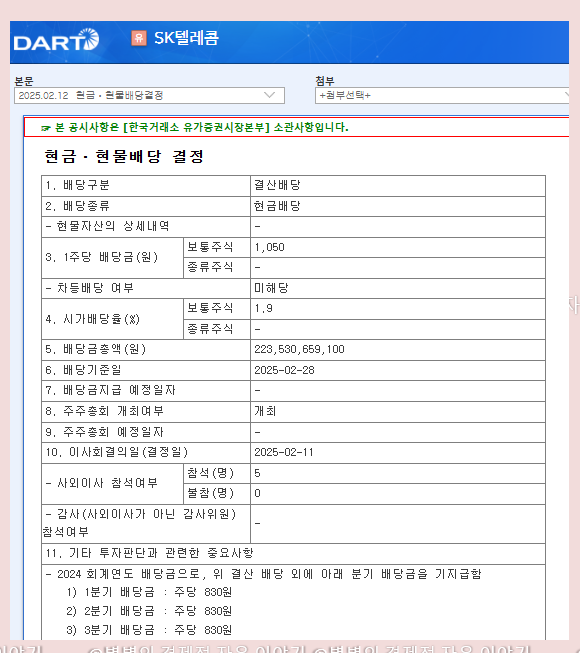 최근 SK텔레코 24년 결산배당 공시가 떴습니다.