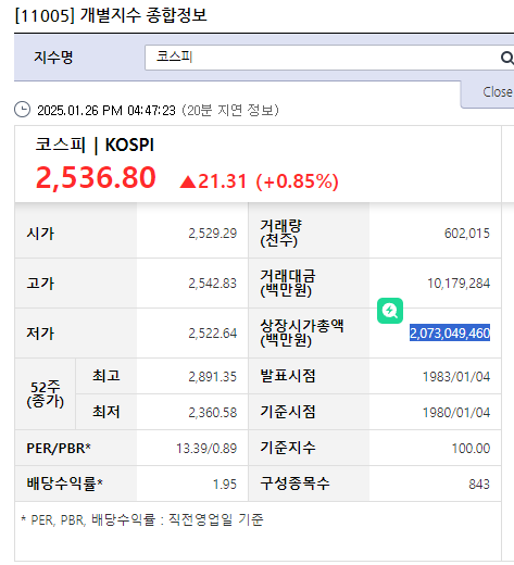코스피 시가총액은 2025년 1월 26일 기준으로