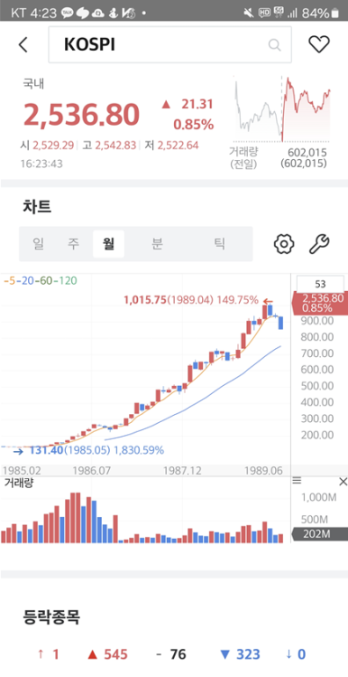 아쉽게도 앱에서는 1985년도부터 코스피 종가가 있는 것 같네요.