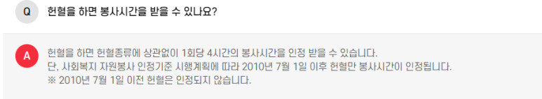 :헌혈을 하면 종류에 상관없이 1회당 4시간 봉사시간 인정