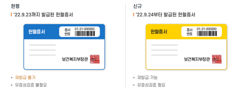 단, 22년 9월 23일까지 발급되었던 헌혈증서(파란색)은