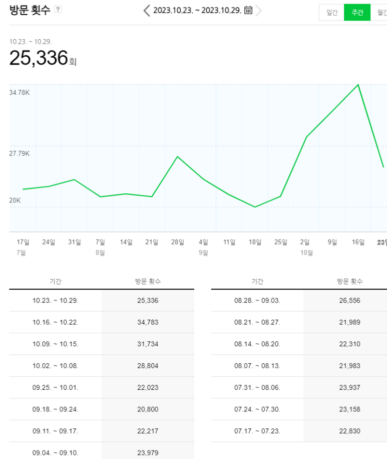 지금까지 주간 데이터로는 1주에 약 2만명대 방문자가