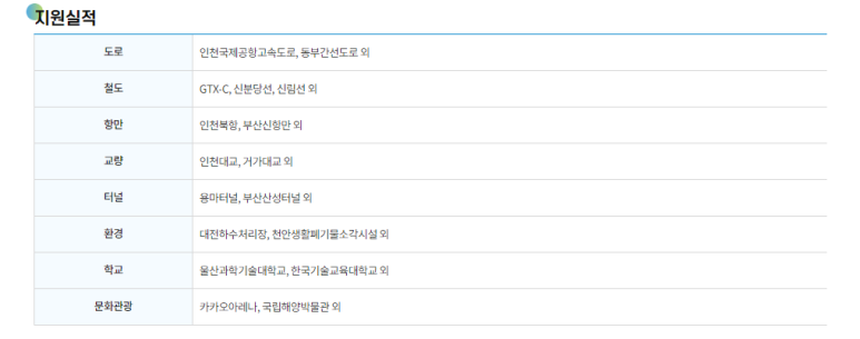 다음과 같은 도로, 철도, 항만, 환경 등의 건설에 활용되었습니다.